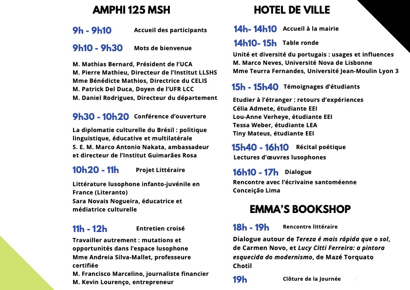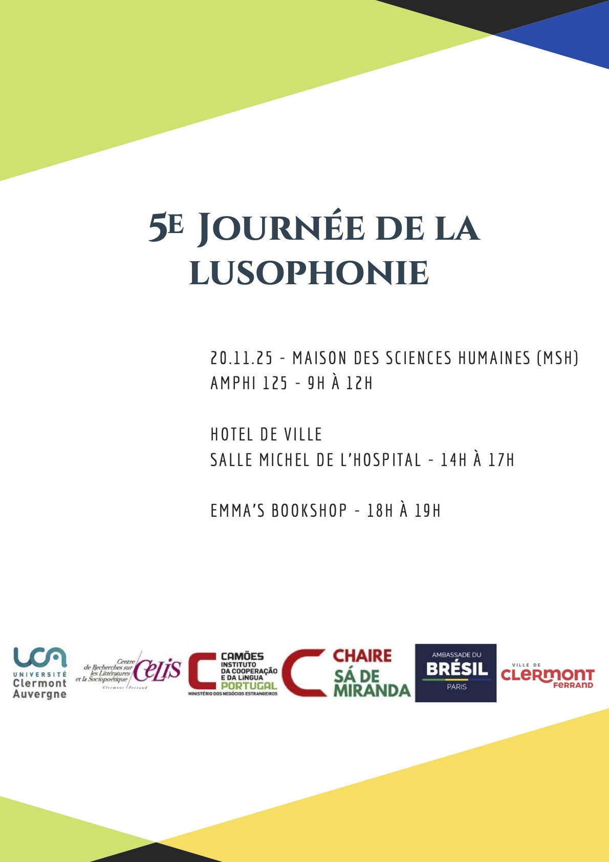 Cette 5e Journée de la Lusophonie est organisée par le Centre de Recherches sur les Littératures et la Sociopoétique (CELIS, UR 4280) de l’Université Clermont Auvergne dans le cadre du Séminaire de la Chaire Sá de Miranda en collaboration avec l’Institut Camões (Portugal) et l’Ambassade du Brésil.