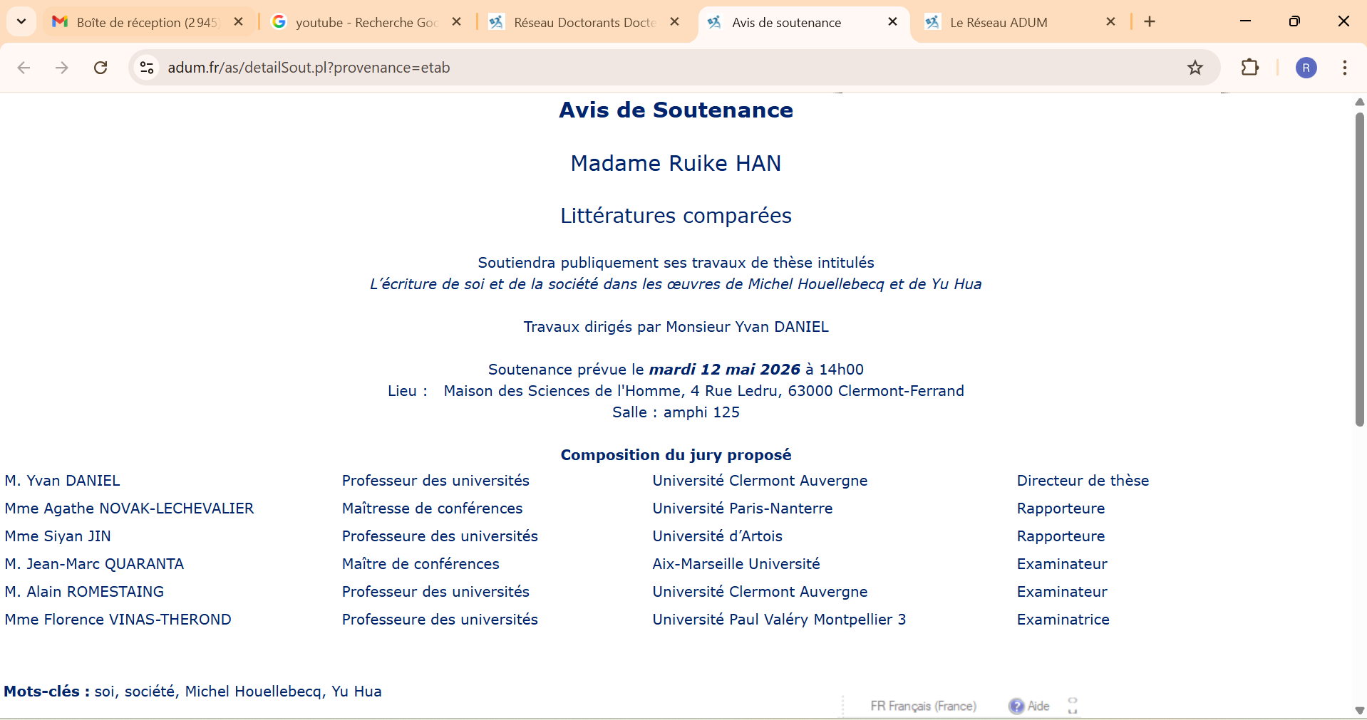 Ruike Han soutiendra sa thèse de doctorat en littérature comparée le mardi 12 mai 2026 à 14h à la MSH de Clermont-Ferrand sur le sujet suivant :