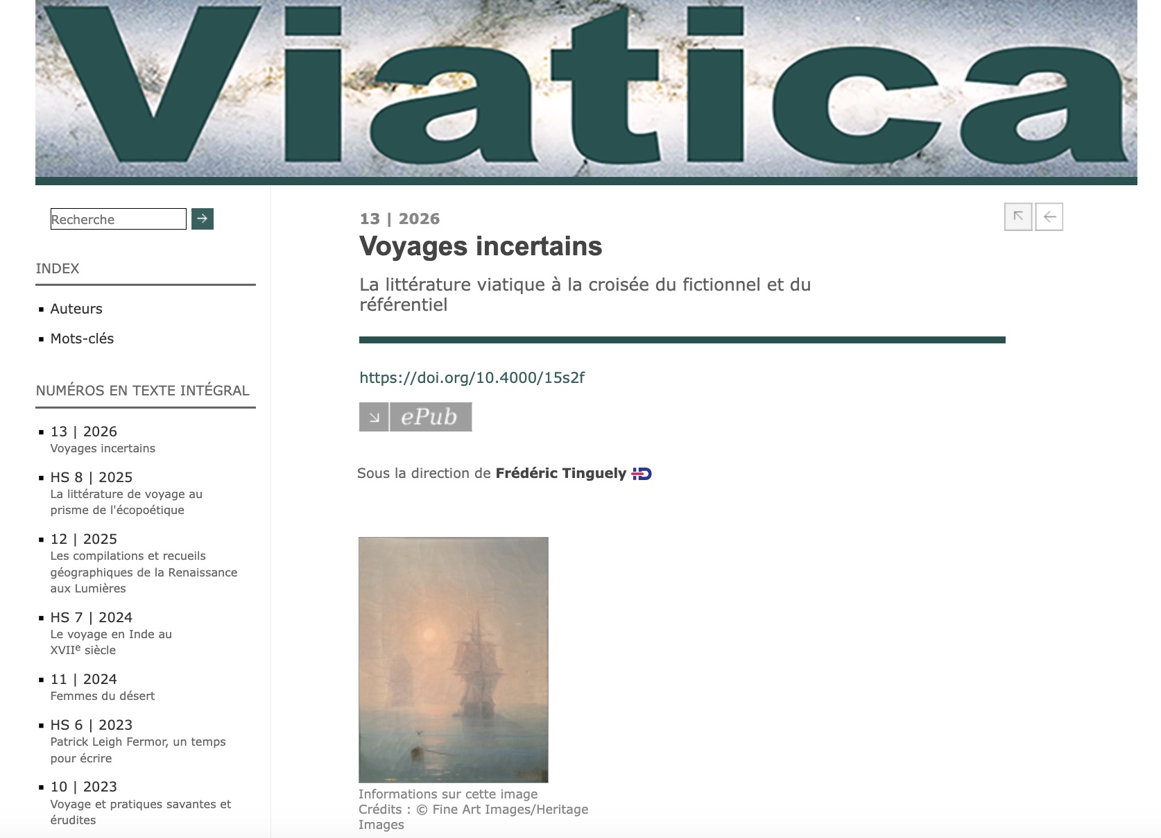 Revue Viatica n° 13 : « Voyages incertains. La littérature viatique à la croisée du fictionnel et du référenciel »